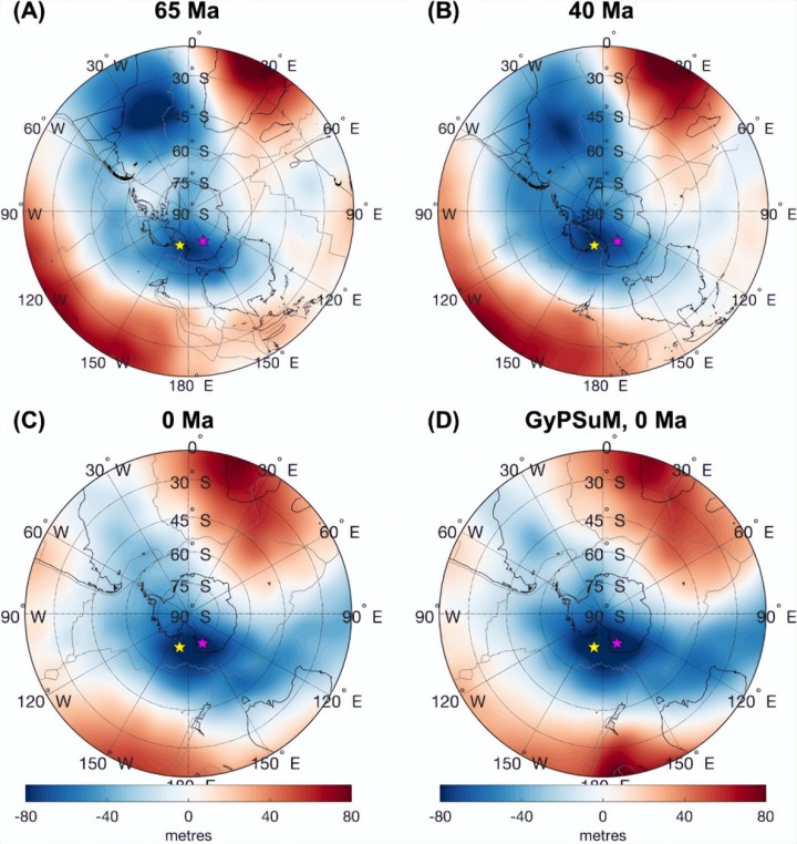 模子败露,一初始,在始新世初(约 6,500 万年前),巨匠重力低点位于南大欧好意思(30°S-45°S),且相对较弱;随后到 5,000 万~3,000 万年前,重力低点的位置快速迁徙至罗斯海湾,同期幅度权贵增强。